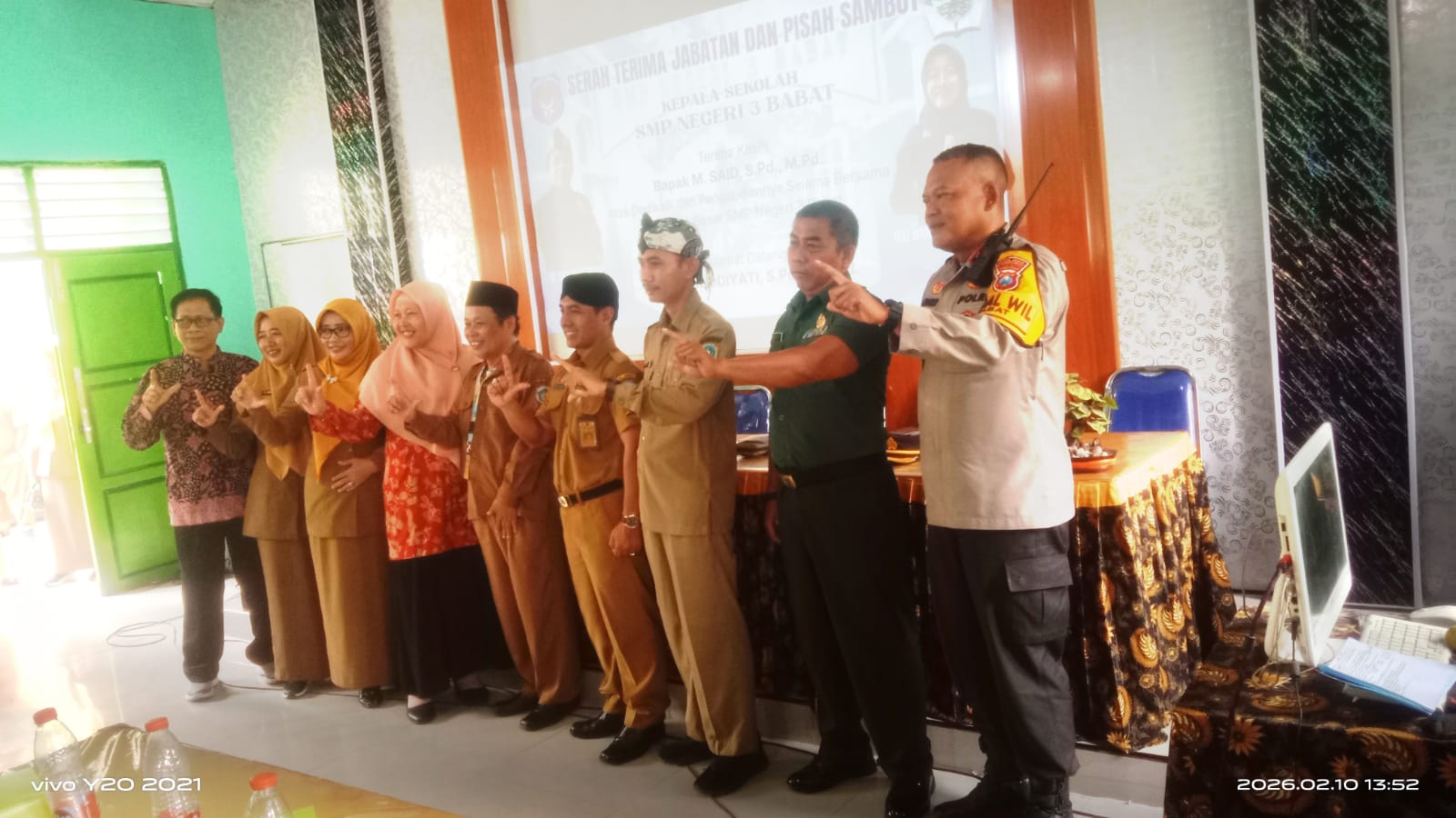 Acara pisah-sambut dihelat di aula SMP 3 Babat, 10 Februari 2026 itu dihadiri guru/karyawan dan komite tuan rumah, kepala desa Gembong, dan guru/karyawan pengantar dari SMP 1 Lamongan.