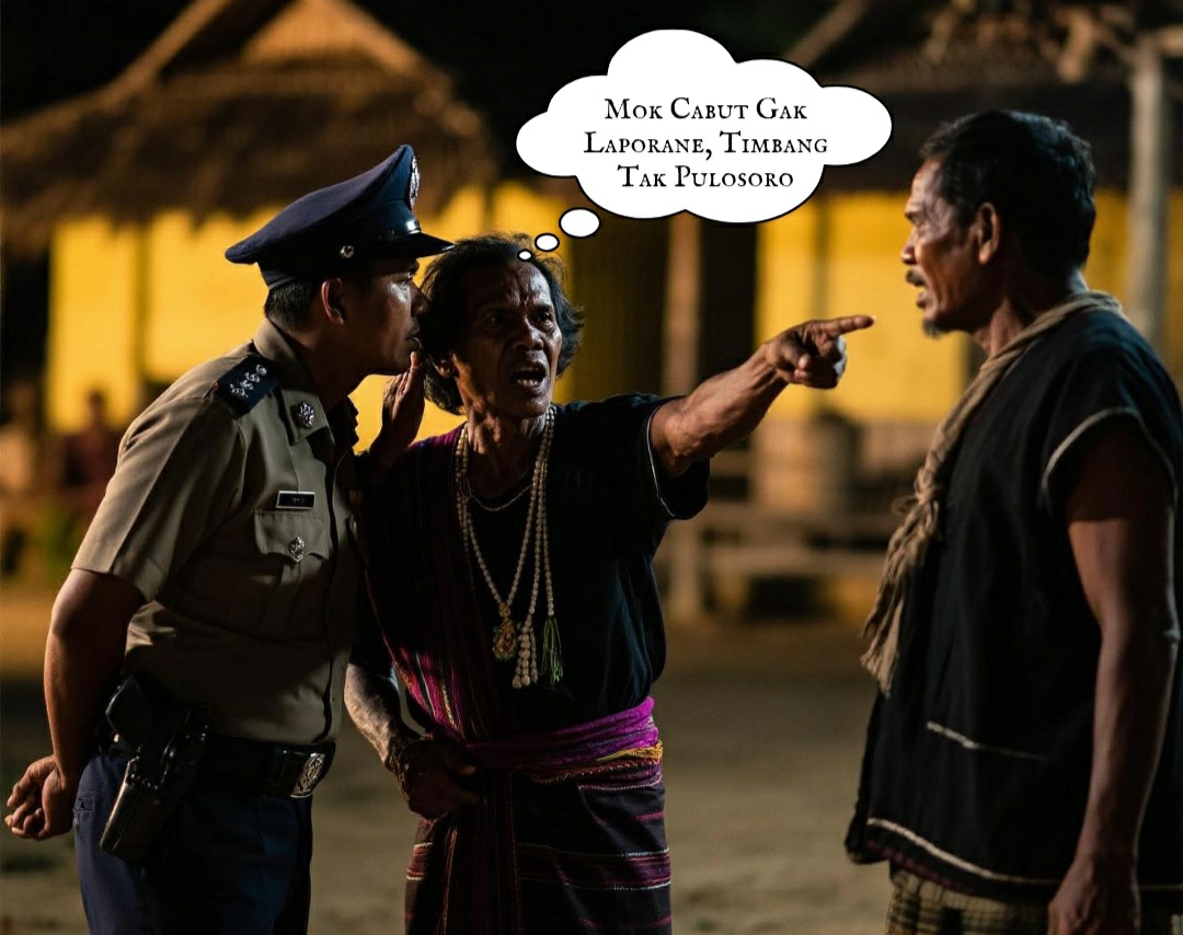 Karena kamu tidak mau membantu menyelesaikan maslah kasus salah tangkap ini, masak kamu sebagai kepala desa gak bisa ngomongi wargamu agar bisa mencabut laporan tersebut ?.