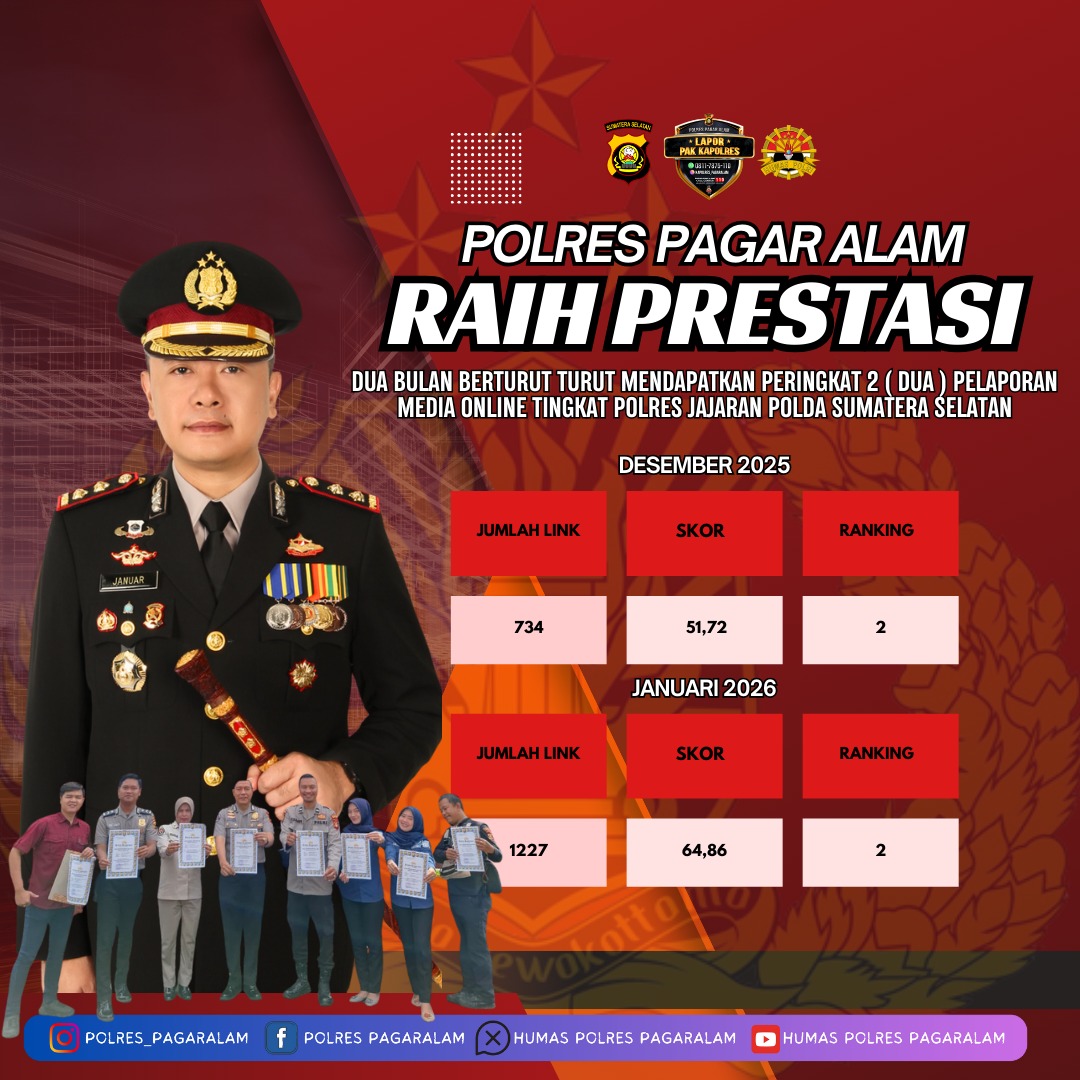 PAGARALAM, Reportase INC – Kinerja Polres Pagar Alam kembali menorehkan prestasi membanggakan. Berdasarkan data rekapitulasi keaktifan laporan media online terintegrasi jajaran Polres Polda Sumsel, Polres Pagar Alam berhasil menempati peringkat Kedua berturut – turut dengan skor tertinggi kedua pada bulan Desember 2025 dan bulan Januari 2026