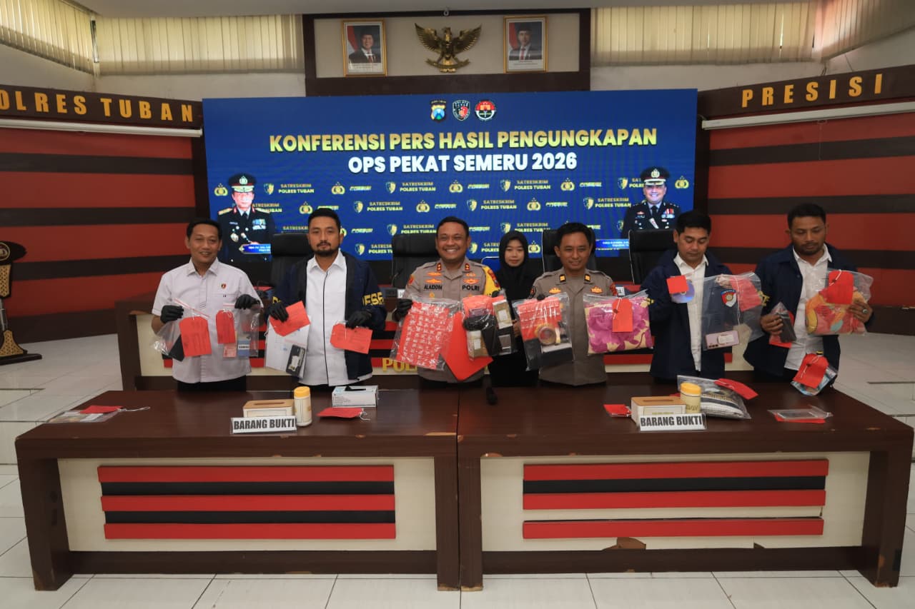 TUBAN, Reportase INC – Polres Tuban menggelar konferensi pers pengungkapan kasus dalam rangka Operasi Penyakit masyarakat (Pekat) Semeru 2026 yang dilaksanakan di Gedung Sanika Satyawada Mapolres Tuban.