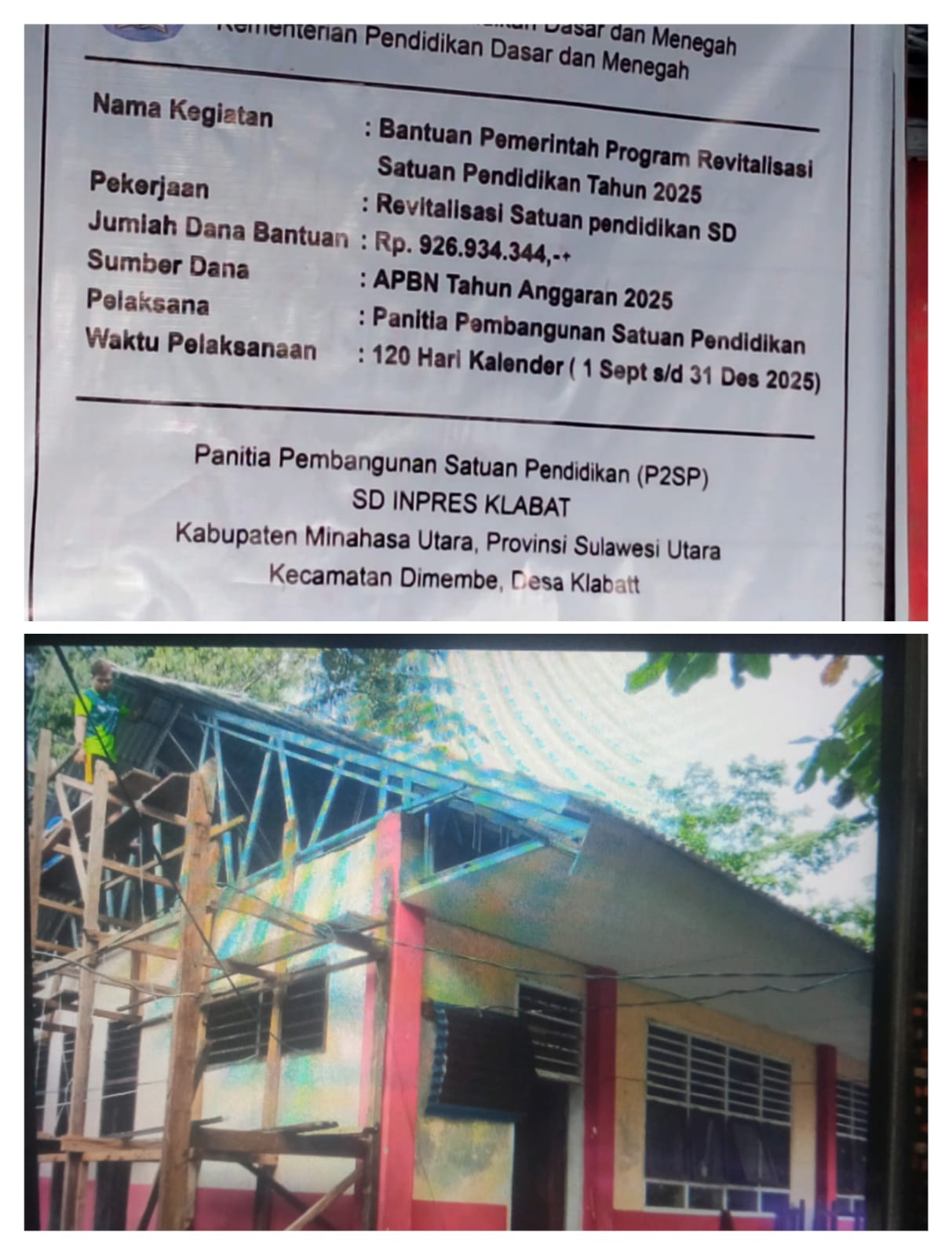 MINUT, Reportase INC – Bantuan revitalisasi Sekolah Dasar Inpres Klabat Kabupaten Minahasa Utara dengan anggaran Rp 926 934.344 (Sembilan ratus dua puluh enam juta sembilan ratus tiga puluh empat ribu tiga ratus empat puluh empat rupiah)